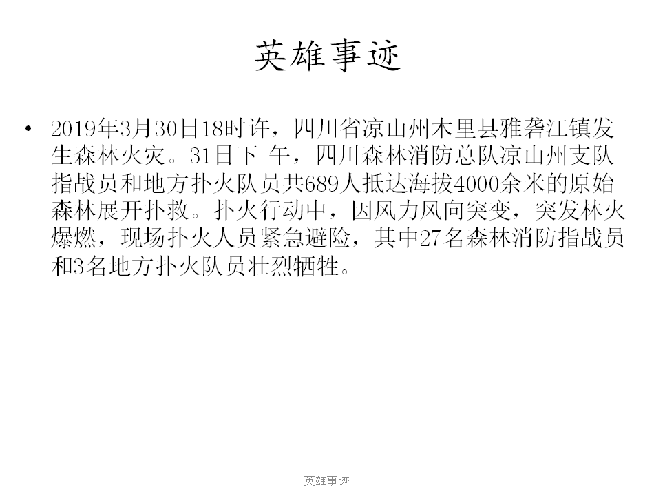 2019年3月30日18时许,四川省凉山州木里县雅袭江镇发生森林火灾。31日下午,四川森林消防总队凉山州支队指战员和地方扑火队员共689人抵达海拔4000余米的原始森林展开扑救。扑火行动中,因风力风向突变,突发林火爆燃,现场扑火人员紧急避险,其中27名森林消防指战员和3名地方扑火队员壮烈牺牲。